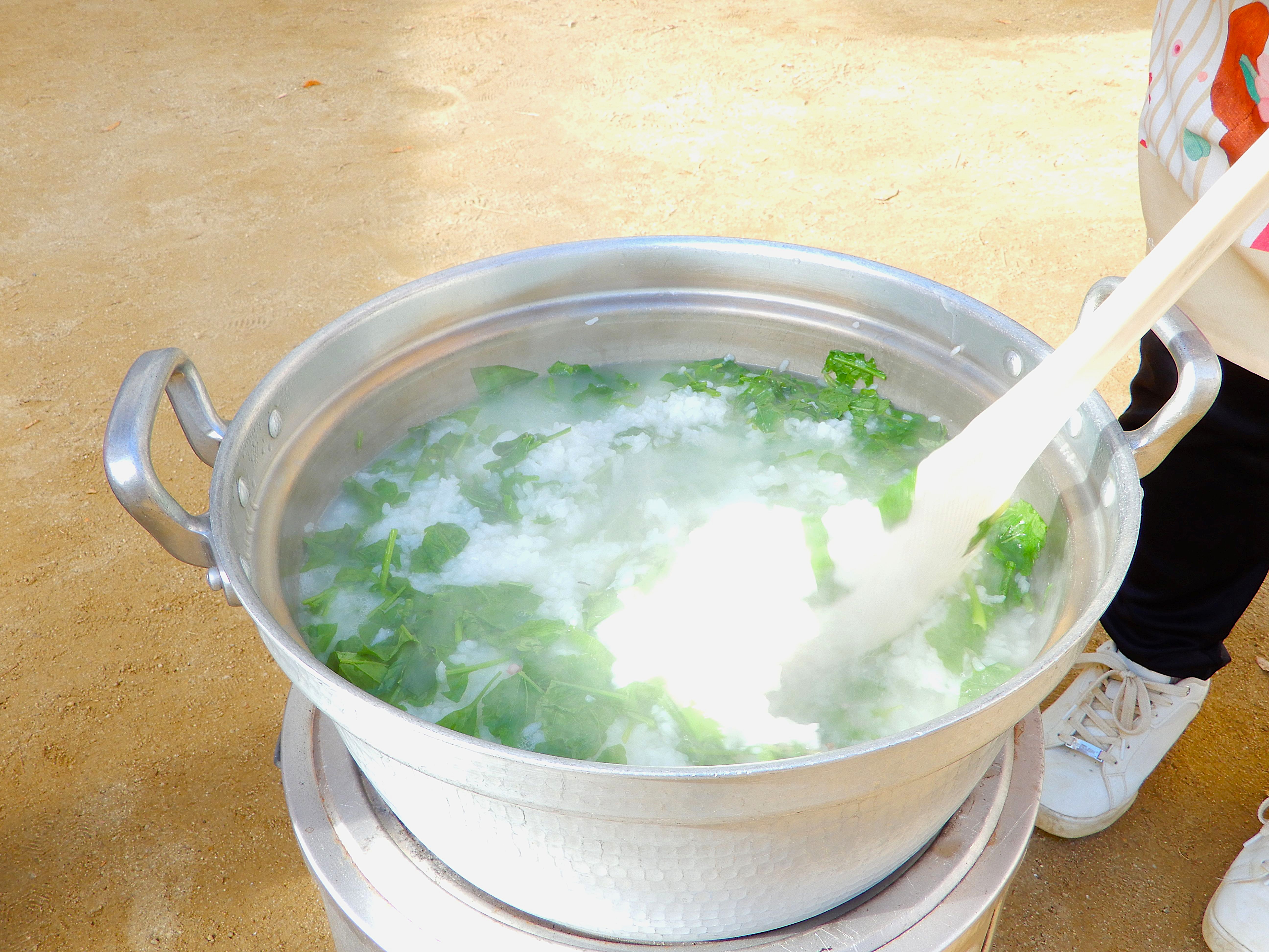 できあがったホカホカの七草がゆを食べ、